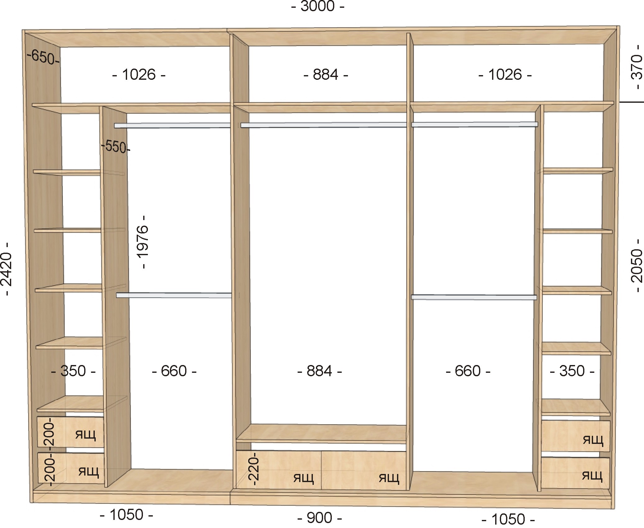 Ескіз шафи купе завдовжки 3 метри, три розсувні двері, (такий часто замовляють)